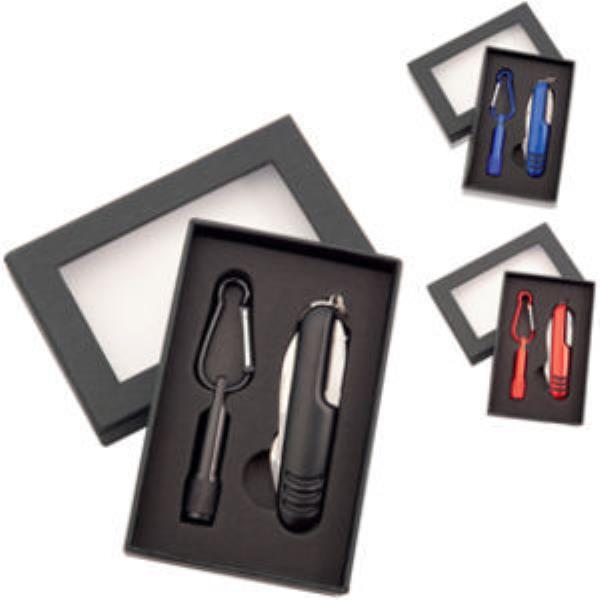 Tool set with aluminium LED torch and multifunction pocket knife in presentation box. Print area of Torch 18x5