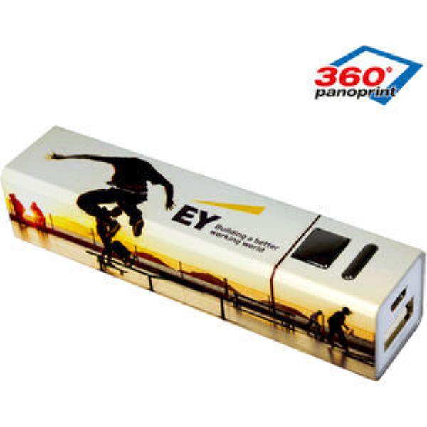 100% print coverage Pano print. Ultra-compact block style metallic power bank. Capacity: 2200mAh. Upgradable to 2600mAh. With micro USB charging cable. Comes in a white gift box. Optional extra iPhone adaptors and multi charge cable. Optional accessories: 3 in one cable and presentation pouch.