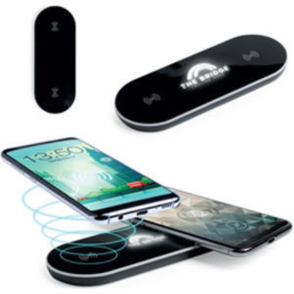 Wireless charger with QI technology for up to 2 devices. Inside LED light and body especially designed for laser printing, illuminating the logo. With nonslip base, compatible with devices equipped with wireless charging technology and presented in an attractive design box. USB cable included.