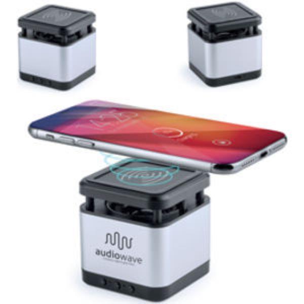 Compact design speaker with integrated wireless charger. Bluetooth connectivity, with lithium battery and 3W power. Handsfree function, with nonslip base and rechargeable via USB cable included. Presented in an attractive design box.