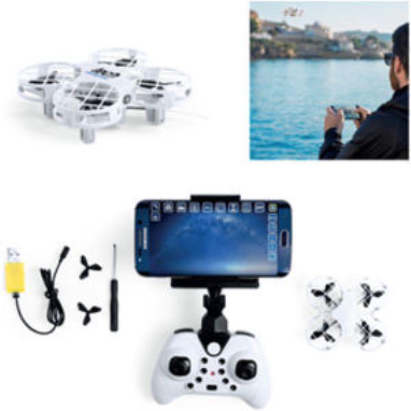 Compact size dron in resistant ABS material. WiFi connectivity, with video recording and photo shoot modes. Drone control via smartphone APP for iOS and Android or by means of a remote control included. With auto hover mode automatic flying leaving the dron quiet and floating in the air. Rechargeable dron via USB cable, micro USB cable included, and remote control powered by batteries 3xAAA not included. With 2 spare propellers and a Philips screw driver, including a detailed operating instructions manual. Presented in an attractive design box.