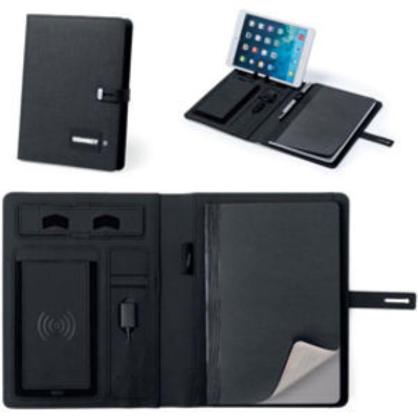 Elegant and practical 300D polyester organizer. With wireless charge and builtin, 4,000 mAh charging capacity auxiliary battery. Including a printing surface on the cover especially designed for laser printing, illuminating the logo. With a sober design and an original closure, including a notepad with 64 sheets, pen holder and LED indicator for charging status. The easy access to the charging station via micro USB cable including makes this organizer the perfect gadget for the business world.