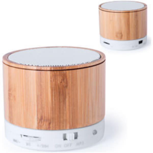 Compact speaker in bamboo. Bluetooth connectivity, 3W power and metal grid. With line input jack 3.5mm and handsfree function. Including slot for micro SD card, FM radio, nonslip base and rechargeable via USB cable included. Presented in an attractive design box.