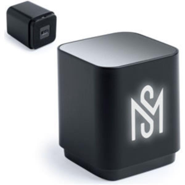 Speaker with Bluetooth connectivity, inside LED light and body especially designed for laser printing, illuminating the logo. 3W power and hands free function. Rechargeable via USB cable included and presented in an attractive, individual design box.