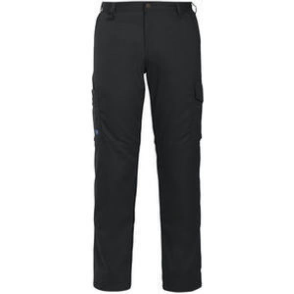Waistpants in stretch fabric without front pleat. Side pockets at front and safety pocket with zipper on right side. Two external back pockets and two leg pockets. Left leg pocket has flap and internal phone pocket. Right leg pocket has room for mobile telephone pens paper and folding rule. D-ring in front. Knee pockets on inside. Loops under back pockets and leg pockets.