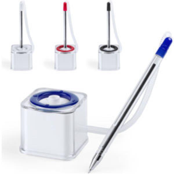 Square plastic pen stand with spiral cord attached ball point pen in matching colours.