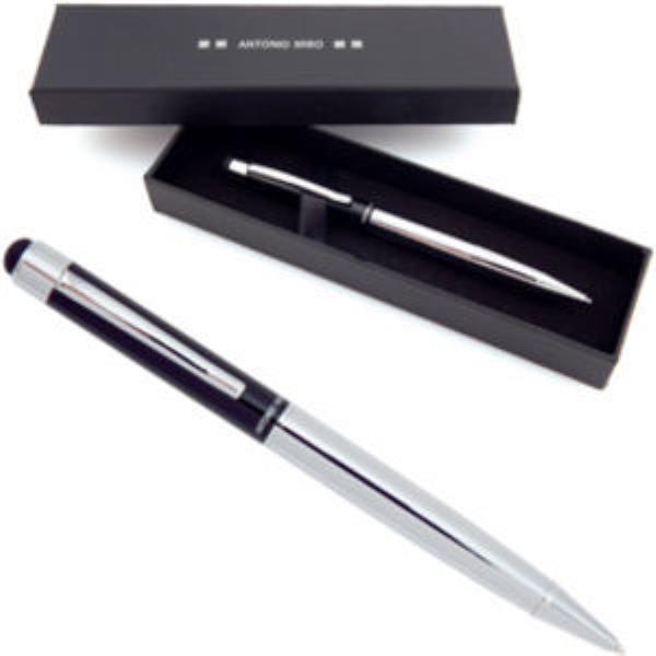 Executive metal pen with touch screen stylus in presentation box with blue ink.