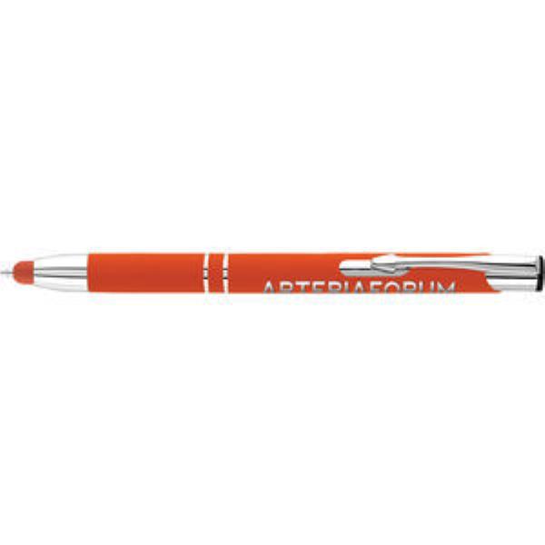 With an aluminium body and soft touch rubberised outer, this push-button ballpen is available in a wide range of bright colours with matching touchscreen stylus. The aluminium base metal will be revealed when laser engraved.