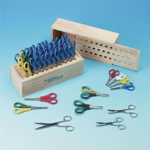 140mm long, blunt/blunt stainless steel blades. Plastic covered handles. 5cm rule marking on blade. Bulk pack containing 84 blue right handed and 12 yellow and green left handed pairs of scissors.
