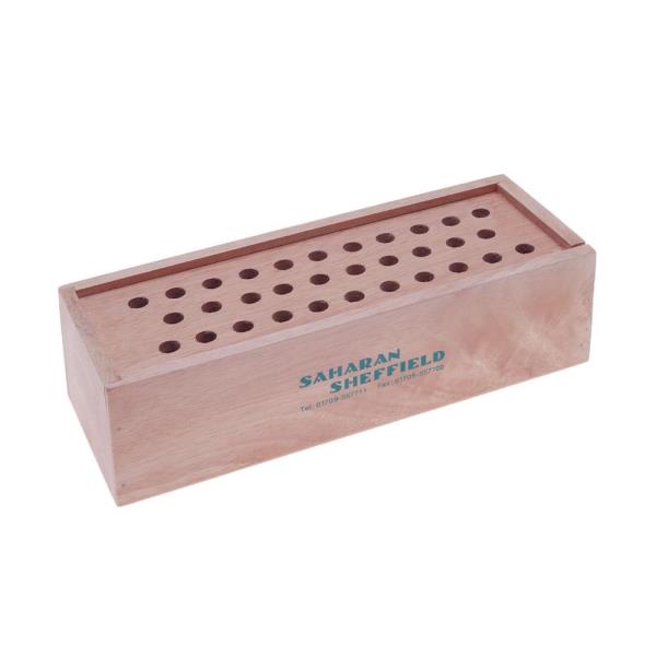 Sturdy wooden box rack to hold scissors for storage and distribution. The slide-off lid has 32 holes for classroom use and easy counting.