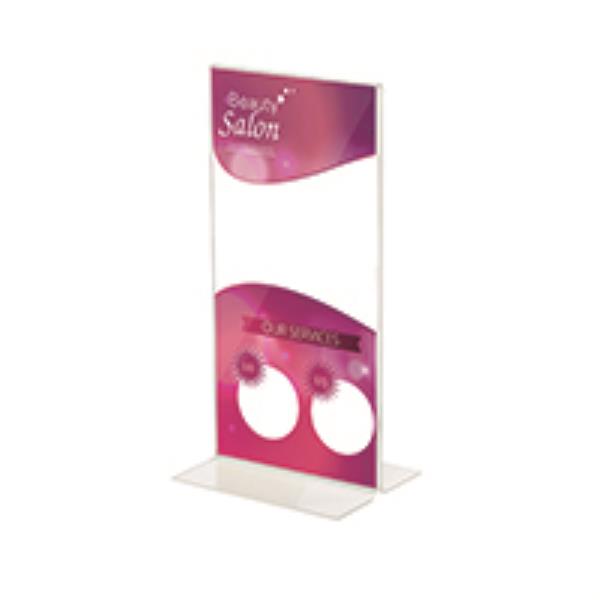 Deflector Stand Up Sign Holder 1/3 A4. For DL sized papers. Keep your messages in front of your customers. Acrylic sign holder displays literature, pamphlets etc. Ideal for restaurants, retail outlets, trade shows etc. Colour - Clear. (A5 size shown)