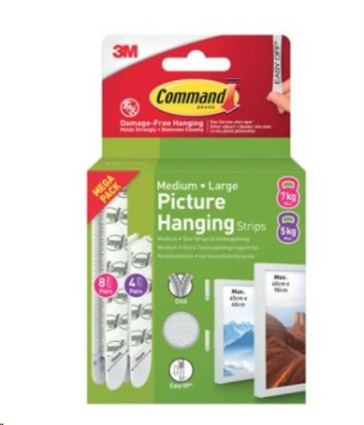 For use at home or in the office, these Command Picture Hanging Strips are an innovative solution for hanging picture frames and artwork securely and damage free. They hold strongly and remove cleanly using 3M stretch release technology. Without the need for nails or tools of any kind, these medium and large hanging strips hold up to 5kg (medium) and 7kg (large). This pack contains 24 adhesive strips in white.
